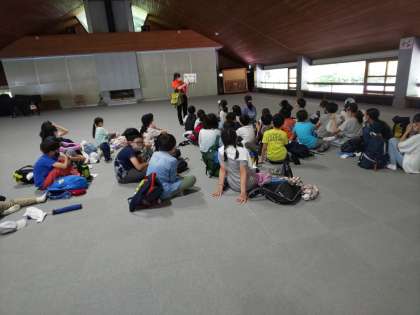 宿舎周辺を散策中、にわか雨が降りだしたため、コースを短縮して宿舎に戻り、2階の村の会堂に移動して、まとめをし、ガイドさんにお礼の気持ちを伝えました。