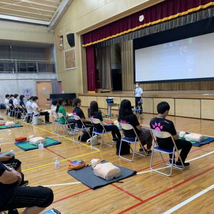 本日、さくらの学び舎(笹原小学校・桜丘小学校・桜丘中学校・桜丘幼稚園)の教職員で救急救命講習を行いました。心肺蘇生の仕方やAEDの使い方を確認しました。