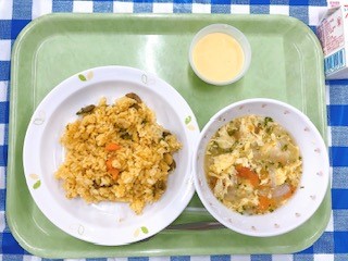 6年生が5年生のときに、給食の献立を考え、提案するという授業を行いました。その時に提案された献立のうちのひとつを、今日の給食に取り入れました。メインのカレーピラフは、一食分の価格や栄養バランスを考え、カレー系は苦手な人が少ないので、フードロスも防げるという理由から献立に入れてくれたそうです。サイドメニューも、カレーピラフにあうものを、栄養バランスを考えて選んでいます。暑い夏にも元気が出るような、すばらしい献立ですね!
