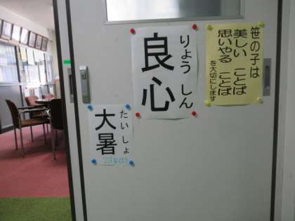 ○今週のキーワードは、7月の人格の完成を目指してのテーマ「良心」です。国語辞典で調べてみると、「ごまかしたり、なまけたりせず、自分が正しいと信じるところに従って行動しようとする気持ち」と書かれていました。ポスターにもみなさんへのアドバイスがありますが、よいことと悪いことの判断をして、自分からよいことを行い、何事も誠実に行っていきましょう。