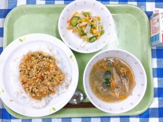 今日は世界の料理給食で、タイの料理を紹介します。ガパオライスは、鶏肉をバジルと一緒に炒めたものを、ごはんにかけて食べる料理です。日本人にも食べやすい、タイで人気の国民食です。春雨スープは、いつもの春雨スープに「ナンプラー」というタイ料理によくつかわれる調味料を入れました。