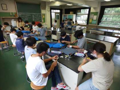 *写真は、体育館で試合やゲームを楽しむバトミントンクラブと卓球クラブ、音楽室で「美女と野獣」からの曲の合奏練習する音楽クラブ、理科室で「アルミ玉」づくりに挑戦する科学クラブの活動の様子からです。