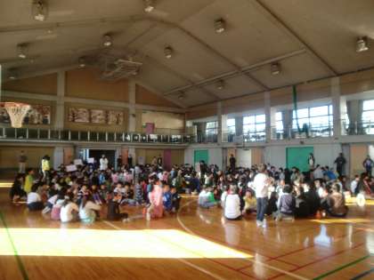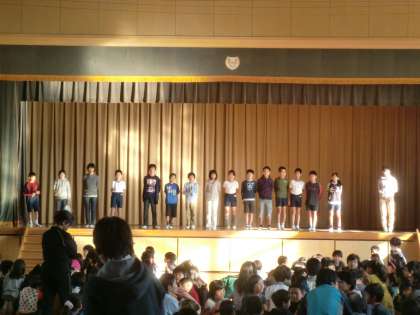 今日の児童集会は、体育館で子どもたちに人気のある「先生当てゲーム」でした。先生に関するヒントが3つ出され、縦割り班のグループで答えを考えます。先生たちの意外な面がわかって、子どもたちは先生への親しみがわいてくるようです。