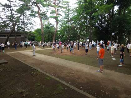 6時25分から、世田谷区ラジオ体操連盟の指導員の方の指導で、みんなの体操、ラジオ体操第1、ラジオ体操第2を行い、心地よく体を動かしました。