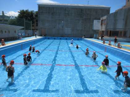 本日1年生は、夏季水泳教室の第1回を行いました。暑い中ですが、多くの子供たちが参加してくれました。