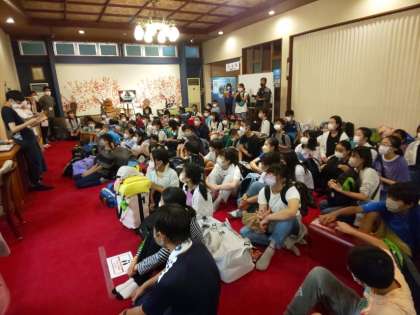 宿舎のロビーで、実行委員の司会進行で開校式を行いました。