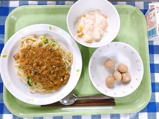 ジャージャー麺は、中国のめん料理です。ひき肉と細かく切った野菜を炒めて甘辛く味付けした「にくみそ」をめんの上にかけて食べます。今日はテンメンジャンとトウバンジャンという中国の調味料をつかって、本格的につくりました。
