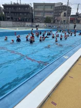 1学期に学習したけ伸びや浮き方、バタ足などを復習した後、泳力別に泳ぎました。
