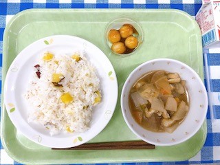 今日は、都合により少し遅くなりましたが、十五夜給食です。今年の十五夜は9月10日で、きれいな満月が見えましたね。十五夜は別名「芋名月」とも言うので、さつまいもとさといもを給食に取り入れました。