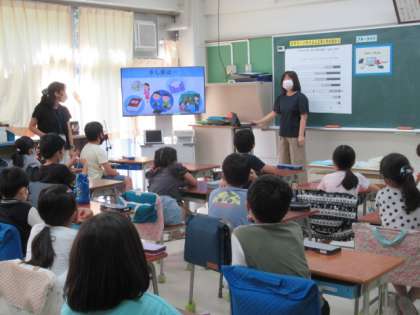 3年生では、学級活動の時間を活用して「スクリーンタイムと上手に付き合おう」を題材に保健指導を行っています。学級担任と養護教諭がティームティーチングで子どもたちへの指導を行います。