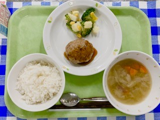 今日から読書週間が始まりました。そこで、読書週間給食として、今日から10月28日まで笹原小学校の図書館にある本とコラボした給食を出します。今日は「ハンバーグつくろうよ」という本に出てくる、おばけのあっちが作ったハンバーグを、給食室でも手作りしました。