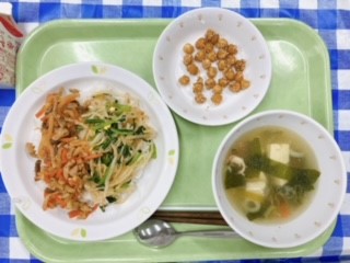 今日は「男子弁当部 オレらの友情てんこもり弁当」に出てくるビビンバを給食で再現しました。主人公のソラを中心とする男子弁当部がつくったビビンバ弁当。普通のビビンバとは少し違って、ある「かくし味」が入っています。
