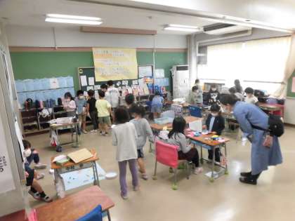 5、6時間目は、9月から学級活動で計画してきた「おまつり」です。「しゃてき」「ボーリング」「さかな釣り」「お花屋さん」「たこ焼き屋さん」「カラオケ・ダンス屋さん」の6つのお店をグループごとに準備して、前半・後半にお店番とお客さんに分かれて楽しみました。