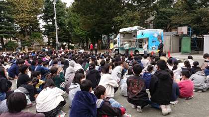 校長先生からのお話の後は、起震車に教員2名が模擬体験を行いました。