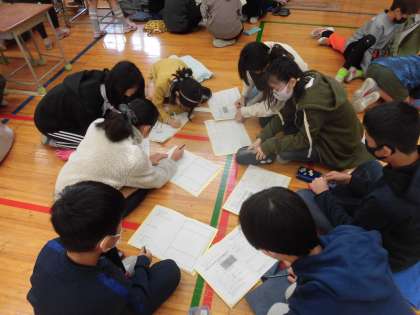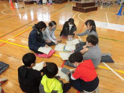 今日は、5・6年合同で体育館に集まり、各学年の児童に、どんな質問をすればいいかを話し合いました。お互いの意見をすり合わせながら質問内容を決めました。