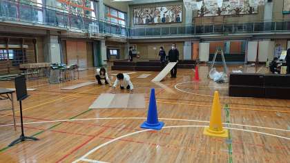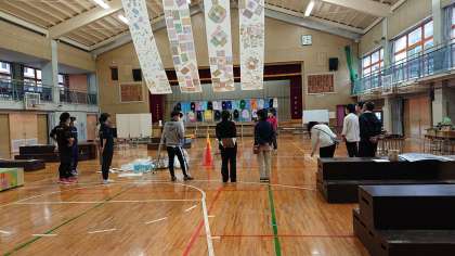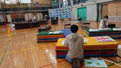 最初に全体確認を行い、各学年毎に平面作品を連結させて展示をしていきます。