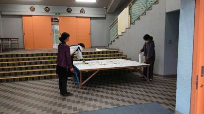 立体作品を展示するための台に布をかけて準備です。