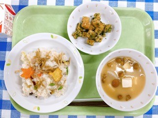 「小さな箱の物語」はいろいろな箱をつかった作品です。給食では。小さな箱のような高野豆腐をカリッと揚げて、から揚げにしました。