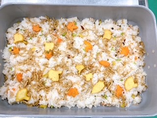 展覧会給食最後の今日は、4年生の作品にちなんだ給食です。「すてきなウッディ—ライフ」は、わくわくするような木の様子が描かれています。給食では、木の枝に見立てたごぼう、紅葉した葉っぱに見立てたさつまいもやにんじん、木の根元の生えているきのこを入れた、ピラフをつくりました。