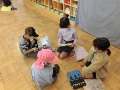 11月25日(金)に桜丘幼稚園のいちご組・さくらんぼ組と本の読み聞かせやぬりえ、おりがみなどをして交流する幼稚園との交流会をしました。