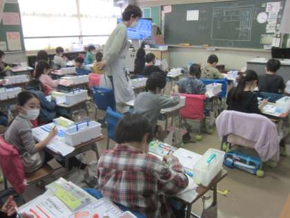 展覧会の「ささはらタウン」の作品では、紙粘土に絵の具を混ぜて使いましたが、パレットに水を入れて準備から後片付けまでの学習をするのは初めてです。
