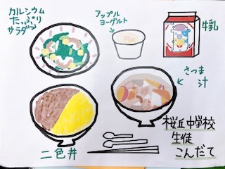 今日はさくらの学び舎給食です。桜丘中学校の生徒が考えた献立を、笹原小学校。桜丘小学校、桜丘中学校の3校が同じ日に実施します。今日の献立のテーマは「カルシウムで骨も体もがんばろう!給食」です。サラダに入っている小松菜やじゃこ、ちくわ、ごまなどは、カルシウムの多い食材です。