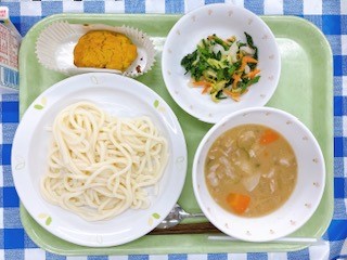 今日はさくらの学び舎給食です。桜丘小学校の児童が考えた献立を、笹原小学校、桜丘小学校、桜丘中学校の3校で同じ日に出しています。この献立のテーマは「寒さに勝とう!温かい給食」です。生姜豚汁つけうどんに入っているしょうがは、体を温める効果があります。旬のほうれんそうや白菜は、寒い冬に一番栄養が多くなるので、しっかり食べて寒さに負けない強い体をつくりましょう。