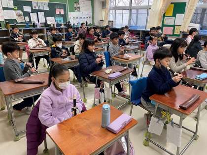 最後に1・2年生が歌、3〜6年生がリコーダーで演奏しました。笹原小の真ん中、渡り廊下のあたりでは、全校の音が美しく混ざっていたそうです。