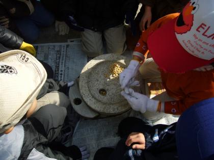七輪を使って餅を焼いたり、石臼で大豆をひいたり、かつお節を削ったりしました。石臼は近所の方から譲っていただいたものです。