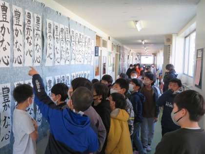 また、各学年の「書き初め」の鑑賞をし、「低学年なのにすごいきれいな字だ。」「この『豊かな心』すきだな。」など、たくさんの作品に触れお気に入りを見付けていました。