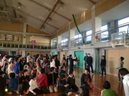 今日の児童集会は、「伝言玉入れ」集会でした。集会委員会で考えたゲームで、伝言ゲームと玉入れを合体させた新しいゲームでした。伝言されても、ボールがバスケットゴールのゴールに入らなければ、終わりません。低学年は、段ボールの箱に入れます。多くの人数で短時間で遊ぶゲームを考えるのはなかなか大変なものです。集会委員会の皆さん、新しい楽しいゲームをありがとう。