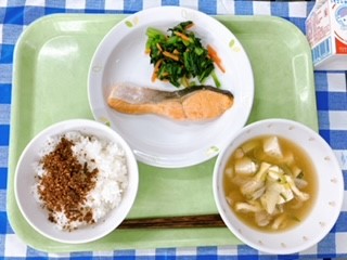 昨日の朝会で校長先生のお話にもあったように、今日から全国学校給食週間が始まります。この1週間は、給食の歴史をふりかえろう!ということで、昔の献立を再現した給食を出します。今日は給食がはじまった当初、明治時代の給食です。山形県のあるお寺で出されたと言われる。日本で最初の給食は、おにぎり・焼き魚・漬物とシンプルなものだったと言われています。それでも、子どもたちの健康を支える、とてもありがたいものです。