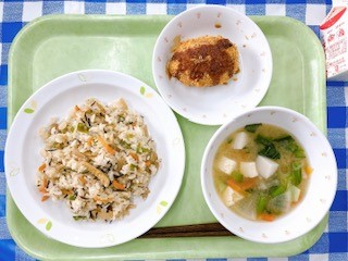 全国学校給食週間2日目は、大正時代の給食を再現します。この時代の給食は、明治時代よりも栄養バランスが考えられた献立が多くなりました、中でも、五目ごはんや栄養みそ汁は、よく食べられていた給食と言われています。どちらも一つの料理に、いろいろな食材が入っているので栄養満点ですが、それでも足りないため、今日はかぼちゃコロッケもつくりました。