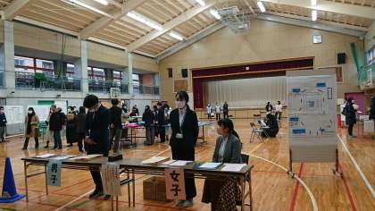 14時30分〜15時30分の時間内に体育館へ来ていただき、受付で個別に「資料配布」を行いました。