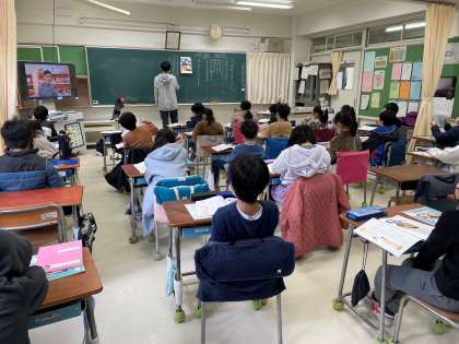 今日は1組の担任が2組で授業をしました。アンパンマンの作者、やなせたかしさんが感じた「うれしいこと」について考えました。