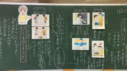 本日、1年生では道徳月間で『あなたって、どんな人?』の学習をしました。一人一人のよさがどこにあるのか、どんなところで輝いているのか、について考えました。「普段から学習がんばっている!」「足速かった!」「友達に優しくしているの見たよ!」と、友達のよいところをたくさん見つけました。