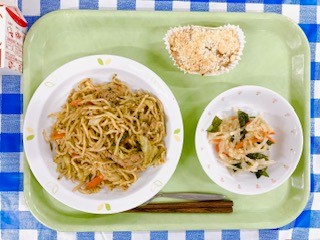 ソース焼きそばは、リクエストの声が多いメニューで、今日ひさびさに給食に取り入れました。たくさんの野菜とめんを一緒に炒め合わせるのは、とても大変です。調理員さんが全身をつかった、一生懸命作ってくれました。デザートも手作りなので、味わって食べてください。
