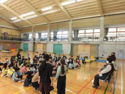 昔遊びを教えてくれた地域の方々に感謝の気持ちを込めて、「手のひらを太陽に」の合唱をプレゼントしました。今後も、地域の方々に見守られながらのびのびと学習ができるよう支援していきます。