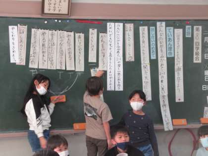 最初に話合いのめあて「友達の意見もよく聞いて、大切にしよう。」を確認し、司会グループの紹介・先生からの話・提案理由の説明があり、話合いが活発に進められました。 提案理由は、「みんなの仲を深めて、2年1組の楽しい思い出を作りたいから。」です。そこで今日は、「どんなサッカー大会をしたらよいか決めよう。」をテーマに、事前に一人一人が学級会ノートに記入した考えを司会グループが短冊に整理し、それを基にみんなで意見を出し合いながら、楽しいサッカー大会にするための思いと願いをまとめていきました。