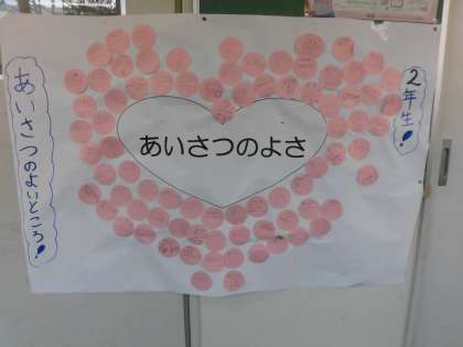 1組も2組もあいさつの素晴らしさを感じながら過ごせるよう1組と2組の間の掲示板にメッセージカードを掲示しました。ぜひ、ご覧になってください。