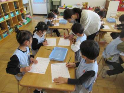 *写真は、笹原小学校の1年教員が桜丘幼稚園ぶどう組で授業を行っている様子です。