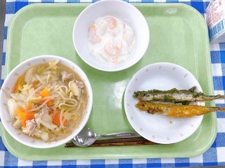 今日はししゃものから揚げを2種類の味付けで作りました。1つは、カレー味です。すこし黄色っぽい色をしています。もう1つは、あおのり味です。磯のよい香りがします。それぞれの味付けを味わって食べてください。