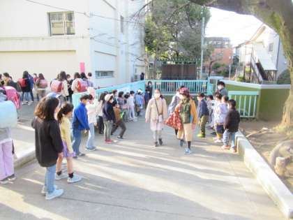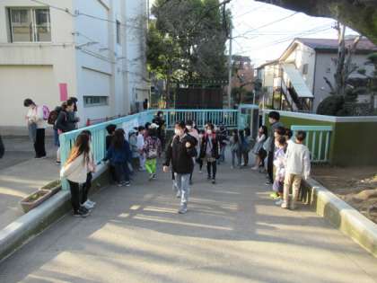 今朝は、春の日ざしが正門前の昇降口付近に射し込んでいます。