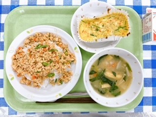 今日は鮭をつかってそぼろ丼をつくりました。鮭はごはんに合うおかずなので、ごはんが進みますよ。卵焼きには、いつものようにひき肉やたまねぎ、にんじんだけではなく、チーズや大豆、香りのよい三つ葉という野菜を入れました。