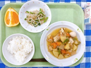 徐々に気温も上がってきて、お店では、春が旬の食べ物をたくさん目にするようになりました。今日は春野菜をつかった煮物をつくりました。煮物に入っている、細いシャキシャキとした食べ物は「ふき」です。ふきは「山菜」と言って、春になると山に生えてくる野菜の一種です。清見オレンジは、この時期がもっともおいしいくだものです。