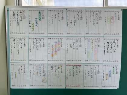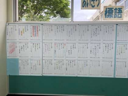 また、2階渡り廊下にはあいさつ標語が掲示されています。6年生の思い思いの標語をぜひ見てみてくださいね★
