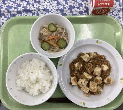 今日は、ごはん、麻婆豆腐、春雨サラダ、牛乳です。