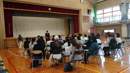 そして、学年全体会では、5年保護者は体育館前方で、6年保護者は体育館後方で学年教員からの学年経営方針や学習、行事等についてお話がありました。