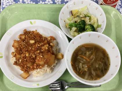 今日は、チリビーンズライス、さつまいもとブロッコリーのサラダ、オニオンスープ、牛乳です。