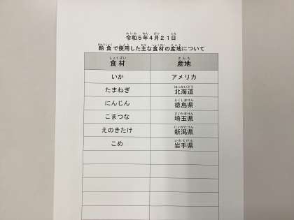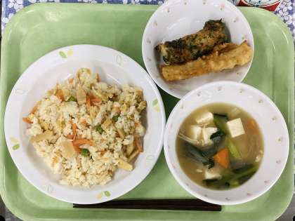 今日は、たけのこごはん、いかの天ぷら、ちくわの磯辺揚げ、豆腐とたまねぎのみそ汁、牛乳です。